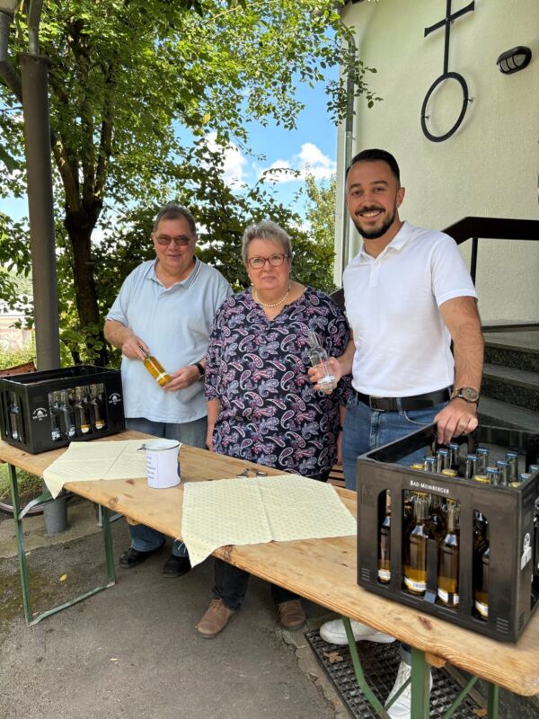 Hannelore und Heinz-Joachim Schulz vom "Gemischten Chor Leopoldstal" haben mit Unterstützung von Bürgermeisterkandidat Celil Celik dabei für zwei Stunden die Getränketheke übernommen und gerne mitgeholfen..
