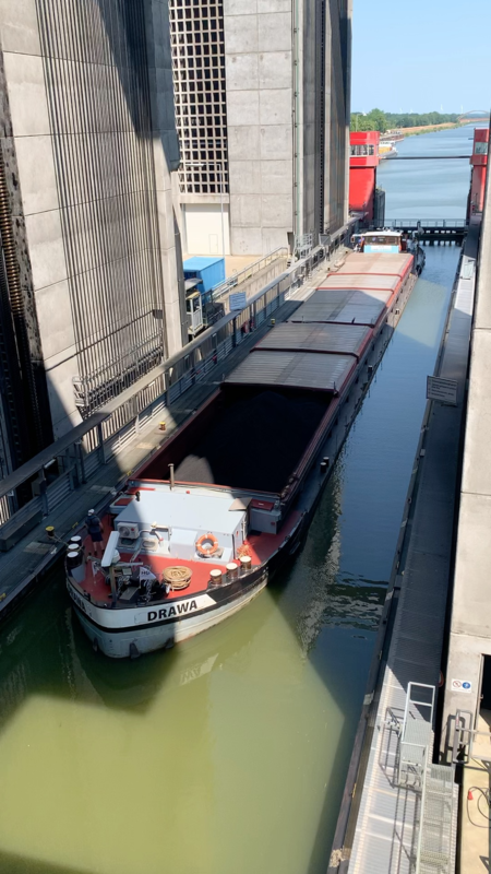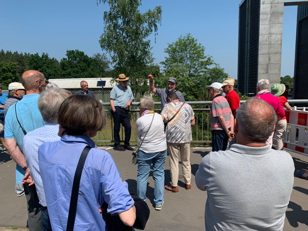 Gegen 11:00 Uhr kamen wir am Schiffshebewerk in Scharnebeck an, wo uns unserer Guide Jörg Ahrfeld, ein ehemaliger Binnenschiffer, schon erwartete. Jörg erkläre das imposante Bauwerk mit kräftiger Stimme. Dieses Schiffshebewerk aus dem Jahre 1975 stellt einen großartigen Beweis von Ingenieurs-Kunst dar. Die zwei Tröge mit einem Einzelgewicht von 6000 Tonnen, heben und senken innerhalb von weniger als 4 Minuten ganze Binnenschiffe mit einer Länge von 100m, einer Breite von 12m und einer Tauchtiefe von 2,8m um 38 m.